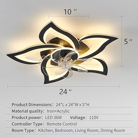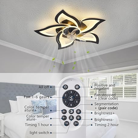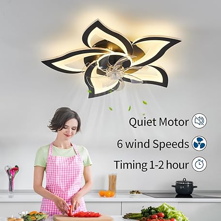 Thông tin sản phẩm Ruibutrade Black Flower Modern CeilingFans with Lights, Low Profile Ceiling Fan with Remote for Bedroom, Flush Mount Ceiling Fan with LED Dimmable Light,6-Speeds, Timing CeilingFan Light