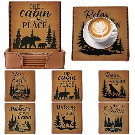 Rustic Cabin Bear Artificial Leather Coasters Set of 6 with Holder Bear Forest Wild Animals Square Leather Drinks Coaster for Farmhouse Country Tabletop Coffee Table Bar Xmas Birthday Gift