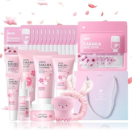 Sakura Skincare Set For Teen Girls & Women, 32PCS Face Care Kit With Cherry Blossom Essence, Serum, Cleanser, Lip Mask, Mud Mask & More