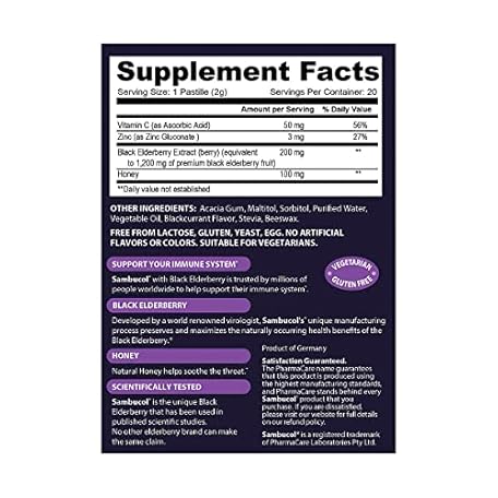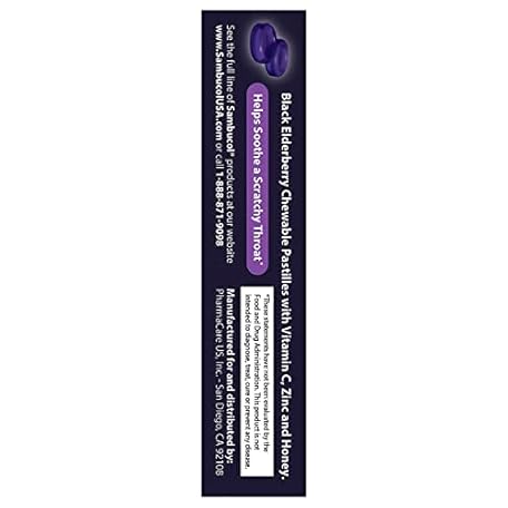 Thông tin sản phẩm Sambucol Black Elderberry Throat Lozenge - Sambucus Elderberry Lozenges With Vitamin C, Zinc & Honey, Helps Soothe a Scratchy Throat, High Antioxidants, Gluten-Free - 20 Count