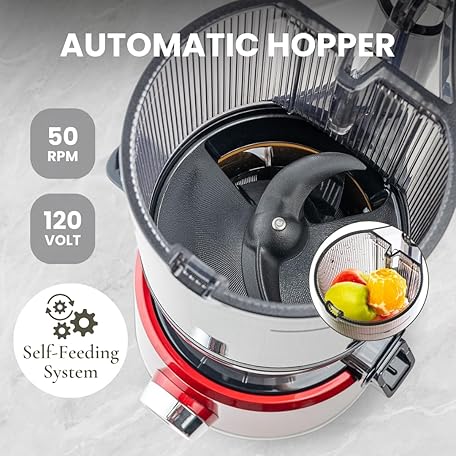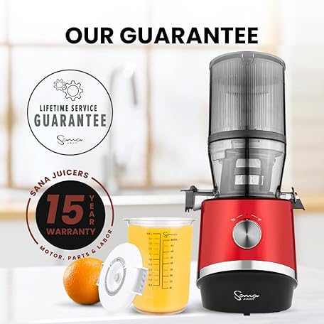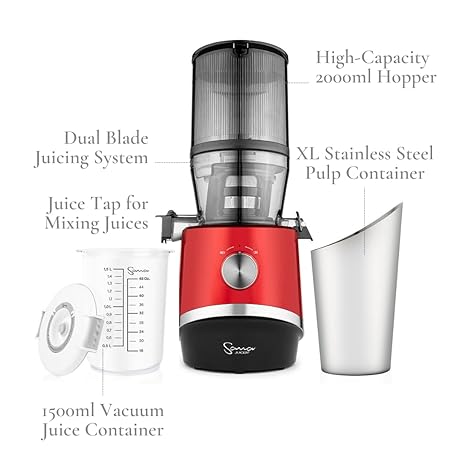 Sana 878 Self Feeding Batch Juicer | 3 Days of Cold Press Juicing Effortlessly | Most Convenient Juicer with Autopilot Configuration | Large Batch 2 Liter Capacity | Whole Fruits & Vegetables | Red