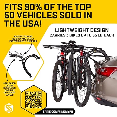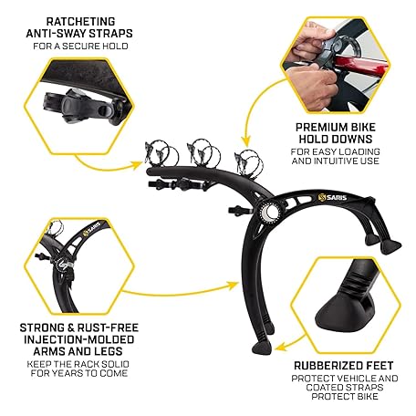 Thông tin sản phẩm Saris Bones EX 3-Bike Trunk Rack Bicycle Carrier, Durable, Rust-Free, Anti-Sway Straps, Fits Most Vehicles, Made in USA, Arc-Based Design, 100% Recyclable Materials