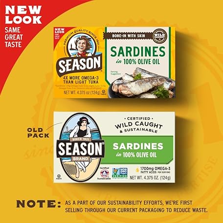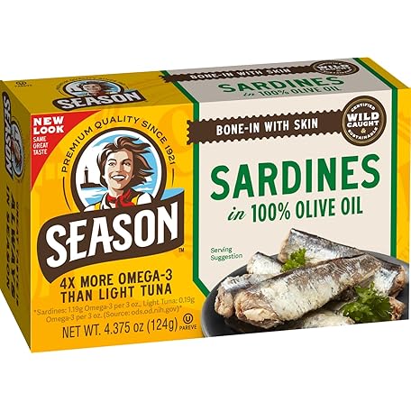Sản phẩm Season Sardines in Olive Oil - Wild Caught, 22g of Protein, Keto Snacks, More Omega 3's Than Tuna, Kosher, High in Calcium, Canned Sardines - 4.37 Oz Tins, 12-Pack đang được bán với giá ưu đãi là $32.6891 tại nước Mỹ.