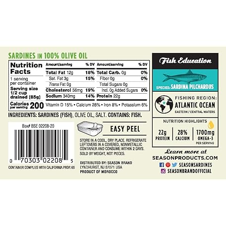 Thông tin sản phẩm Season Sardines in Olive Oil - Wild Caught, 22g of Protein, Keto Snacks, More Omega 3's Than Tuna, Kosher, High in Calcium, Canned Sardines - 4.37 Oz Tins, 12-Pack