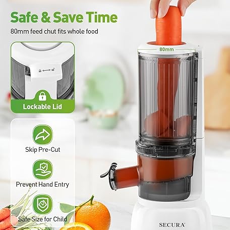 Thông tin sản phẩm Secura Mesh Free Slow Juicer with Stainless Steel Prong Spiral Auger, Cold Press Juicer, Masticating Juicer Machines with Quiet Motor & Reverse Function for Vegetables and Fruits, White