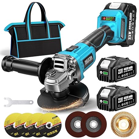 Seesii Cordless Angle Grinder 4-1/2 Inch, 21V Brushless Battery Grinder Tool with 2X 4.0Ah Batteries, 10000RPM for Metal Cutting, Grinding, Polishing, Rust Removal (Blue)
