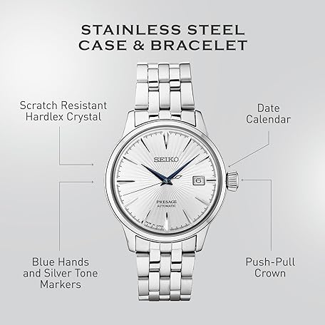 Sản phẩm SEIKO SRPB77 Automatic Watch for Men - Presage Cocktail Time - Patterned Silver Dial with Gloss Finish, Date Calendar, 50m Water-Resistant đang được bán với giá ưu đãi là $376.05 tại nước Mỹ.
