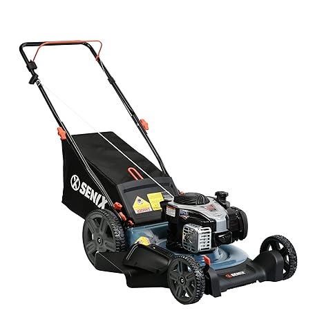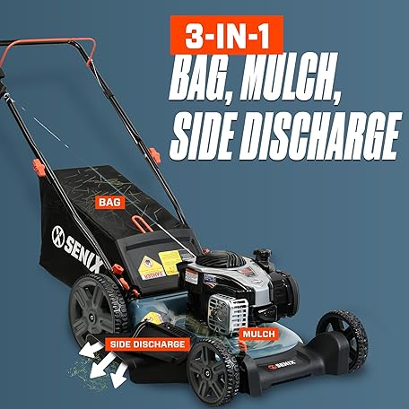 Thông tin sản phẩm SENIX LSPG-M7 21'' Gas Push Lawn Mower, with 140 cc 4-Cycle Briggs & Stratton Engine, 3-in-1 Bagging, Mulching, and Side Discharge, 6-Position Dual Lever Height Adjustment, 16 Gallon Grass Bag