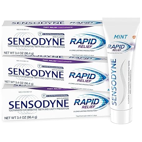 Sản phẩm Sensodyne Rapid Relief Toothpaste for Sensitive Teeth, Mint with Fluoride, Adult Sensitive Toothpaste for Painful Teeth and Gums, Long Lasting Protection, 3.4 oz (Pack of 3) đang được bán với giá ưu đãi là $23.6639 tại nước Mỹ.