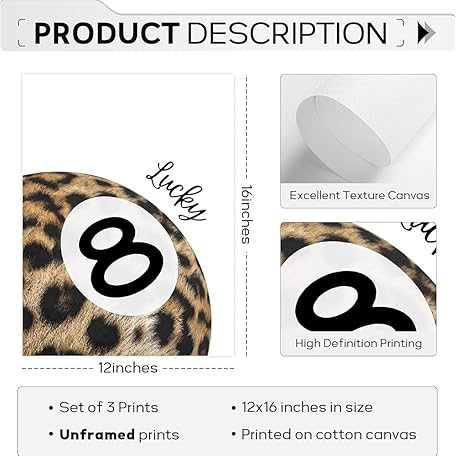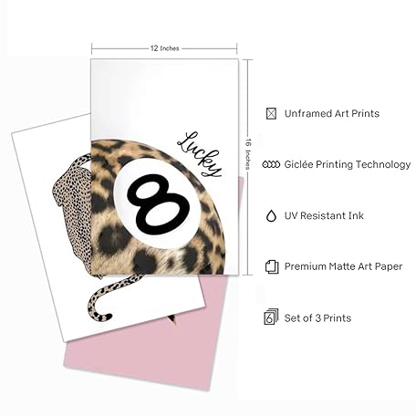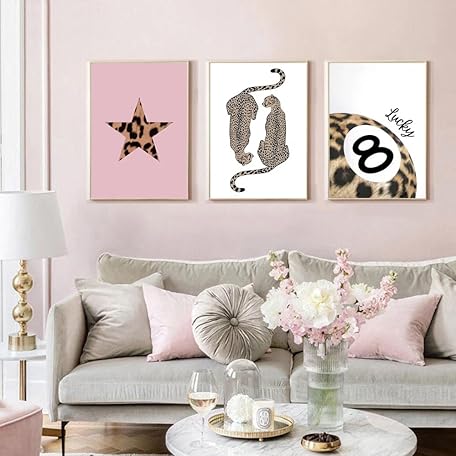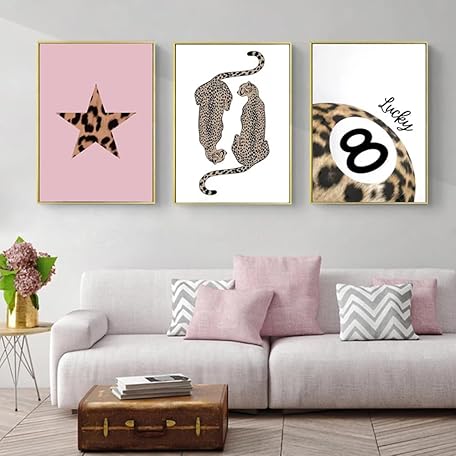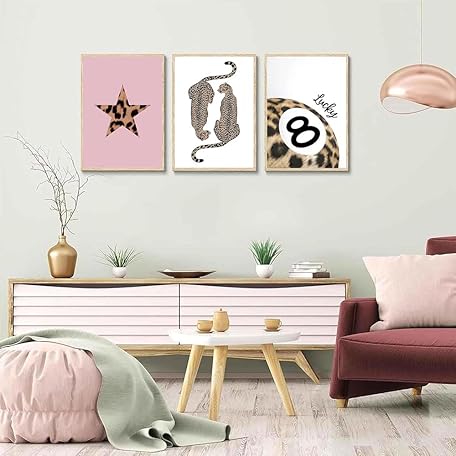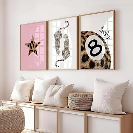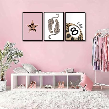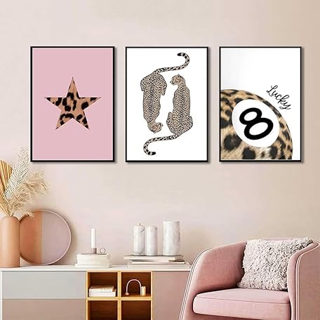 Set of 3 Preppy Cheetah Wall Art Trendy Pink Leopard Canvas Prints Star Lucky 8 Ball Posters Aesthetic Wall Decor Pictures for Girly Bedroom Apartment Dorm Unframed 12x16in