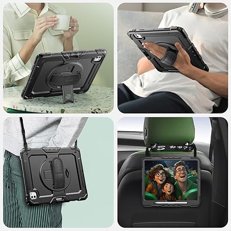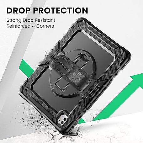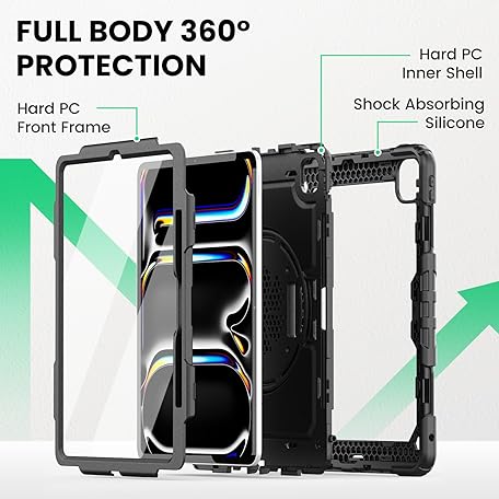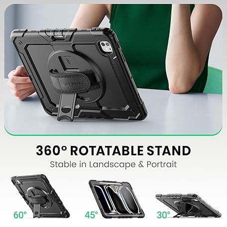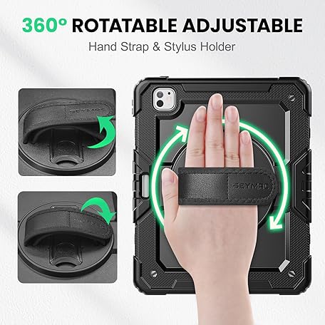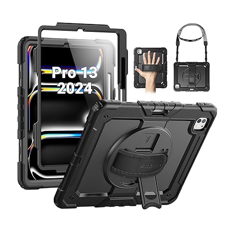 SEYMAC Case for iPad Pro 13 Inch M5 2025 / M4 2024, Heavy Duty Shockproof Protective Case with Screen Protector, 360° Rotating Stand, Hand/Shoulder Strap and Pen Holder, Black