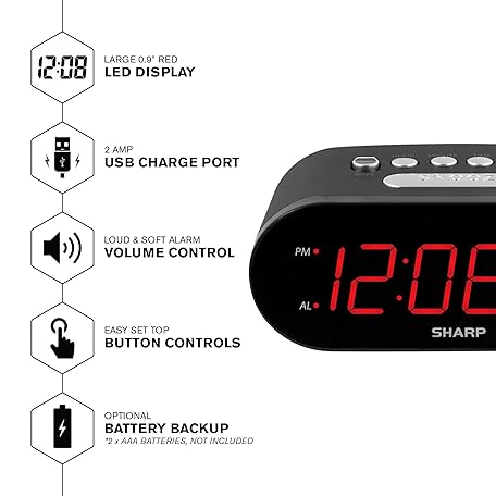 Thông tin sản phẩm Sharp Digital Easy to Read Alarm Clock with 2 AMP High-Speed USB Charging Power Port - Charge Your Phone, Tablet with a high Speed Charge! Simple, Easy to Use Operation, Midnight Black