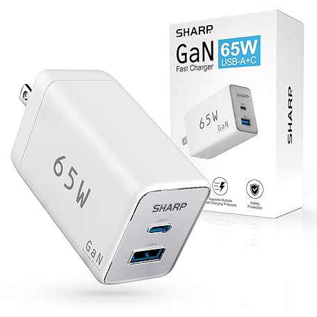 Thông tin sản phẩm Sharp USB C Charger, 65W, 2 Port (USB A+C), Compact Foldable GaN Fast Charge for MacBook Pro/Air, iPad Pro, Galaxy S23, Dell XPS 13, Note 20/10+, iPhone 15/Pro, and More - White, G451A1CU-WHT