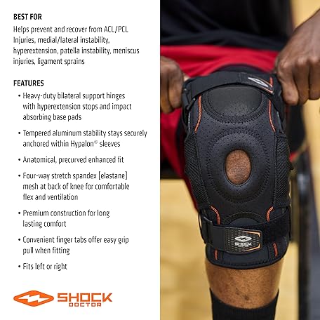 Thông tin sản phẩm Shock Doctor Knee Brace, Compression Knee Brace for Men & Women, Hinged Knee Brace with Side Stabilizers, Maximum Support, Adjustable Dual Hinges, Knee Braces and Knee Support