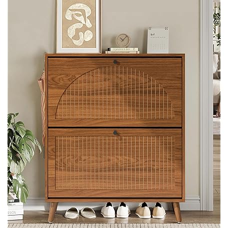 Shoe Storage Cabinet for Entryway with 2 Flip Drawers, Narrow Wood Shoe Cabinet with Fluted Panel, Freestanding Hidden Shoe Organizer for Foyer, Hallway (Walnut)