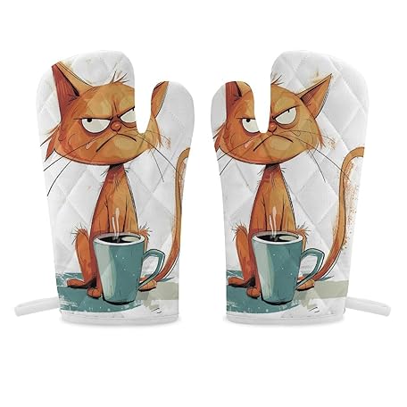 Silly Looking Cat with Morning Cup of Coffee Oven Mitts 2 Pcs, Cartoon Heat Resistant Glove Trendy Non-Slip Baking Mitts Kitchen Accessories