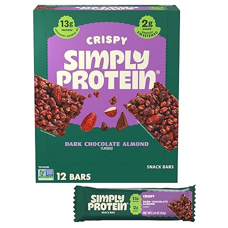 Thông tin sản phẩm Simply Protein - Dark Chocolate Almond Crispy Bars - Plant Based Protein Bars - Low Carb, Low Sugar, High Fiber - 13g Protein, 2g Sugar, 7g Fiber - Vegan, Gluten Free, Non GMO, Kosher - 12 Bars