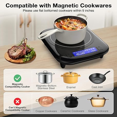 Thông tin sản phẩm Single Induction Cooktop,1800W 110V Single Burner Cooktop,Induction Hot Plate with 5 Cooking Modes, Electric burner with LCD touch control,9 Temperature Levels & 4H Timer,Overheat protection