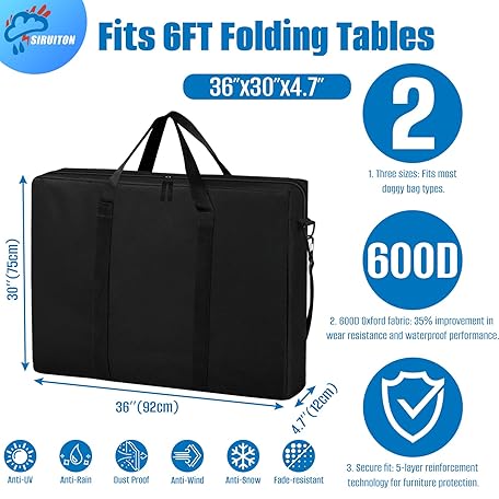 Thông tin sản phẩm SIRUITON Folding Table Storage Bag, Portable 600D WaterProof Carry Bag for Folding Picnic/Camp Tables with Reinforcing Plate & Shoulder Strap, 36" D x 30" W x4.7 H Fits 6FT Folding Tables(Bag Only)