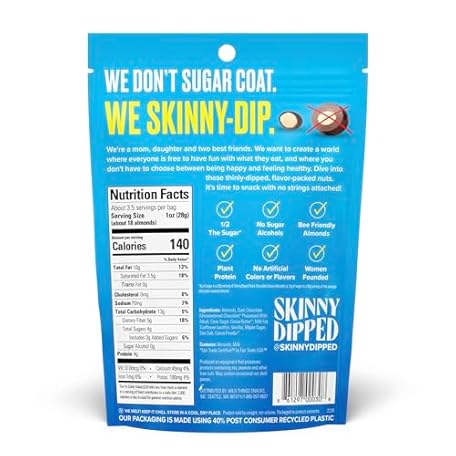 Thông tin sản phẩm SkinnyDipped Dark Chocolate Cocoa Almonds, Healthy Snack, Plant Protein, Gluten Free, 3.5 Oz Resealable Bag, Pack of 1