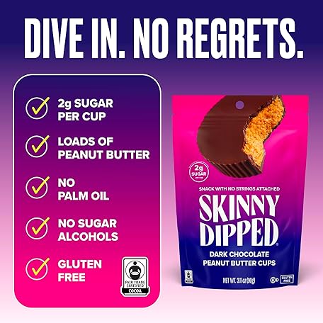 Thông tin sản phẩm SkinnyDipped Dark Chocolate Peanut Butter Cups, 2g Sugar per Cup, Keto Friendly, No Stevia, Gluten Free, 3.2oz, 1 Pack (6 Cups Total)