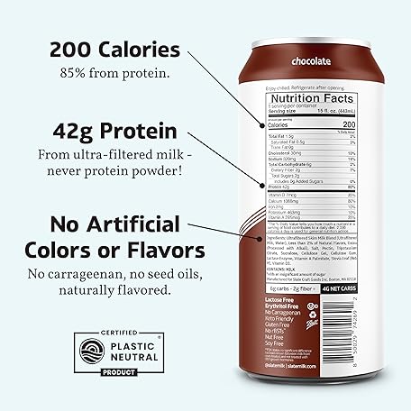Slate Milk - Ultra Protein Shake - Chocolate - 42g Protein, 2g Sugar, 200 Calories, 4g Net Carbs - Lactose Free, No Added Sugar - Made with Ultra Filtered Milk - Breakfast Boost, Post Workout - 15 fl oz, 12 Cans