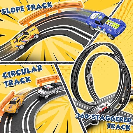 Thông tin sản phẩm Slot Car Race Track Sets with 4 Slot Cars, Electric Race Car Track Include Slope Circular Overpass Track, Dual Racing Game Featuring Flash Bridge and Pendulum, Gifts Toys for Boys Kids Age 6 7 8-12
