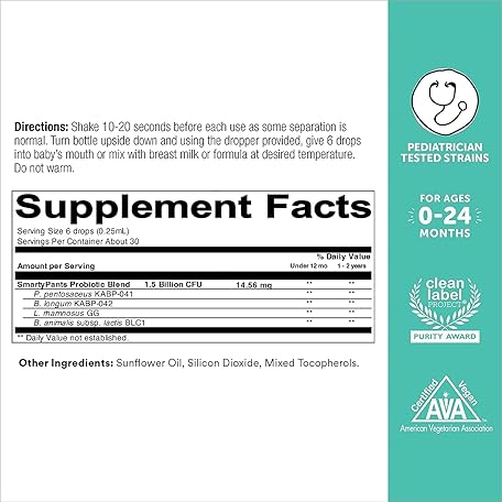 Thông tin sản phẩm SmartyPants Baby Probiotic Drops: Probiotics for Digestive Health and Immune Support Supplement, for Infants 0-24 Months, Vegan, Gluten Free, Pediatrician Tested (30 Day Supply)