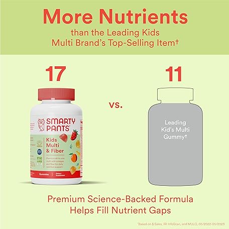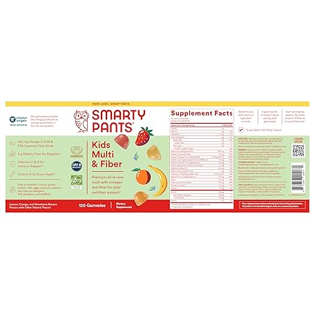 Thông tin sản phẩm SmartyPants Kids Multivitamin Gummies and Fiber Supplement: Vitamin D3, C, Vitamin B12, B6, A, Zinc, Biotin, Inositol, Fiber Gummies, Three Fruit Flavors, 120 Count (30 Day Supply)