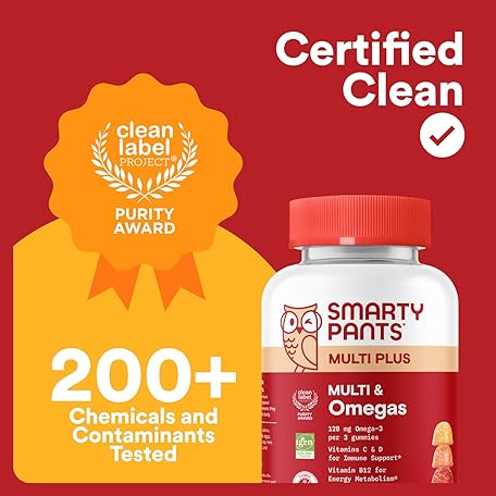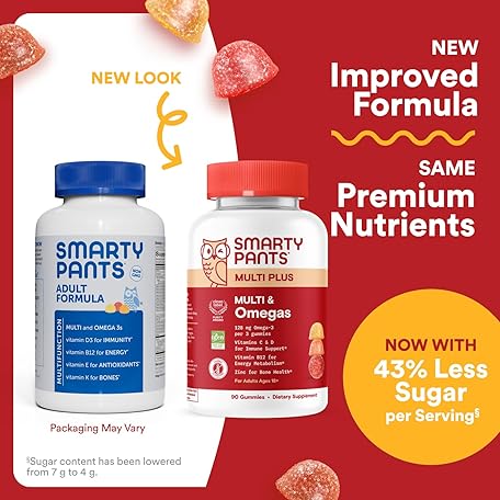 SmartyPants Multivitamin for Men & Women - Improved Formula: Multivitamin Gummies with Omega 3 (DHA/EPA), Vitamin D3, C, Vitamin B12, B6, A, K & Zinc, Biotin, Gluten Free, 90 Count (30 Day Supply)