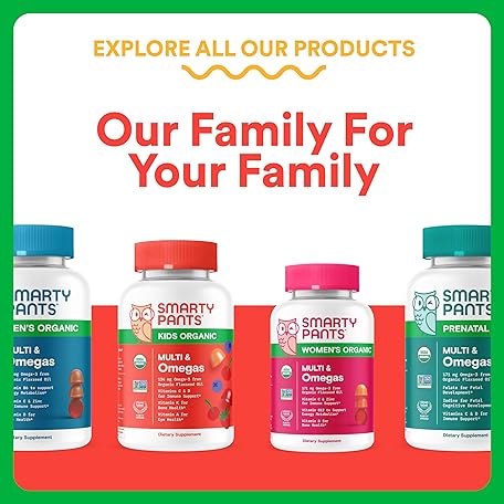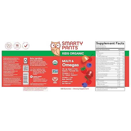 Thông tin sản phẩm SmartyPants Organic Kids Multivitamin Gummies: Omega 3 (ALA), Vitamin D3, C, Vitamin B12, B6, A, K & Zinc for Immune Support, Biotin, Vegetarian, Three Fruit Flavors, 120 Count (30 Day Supply)