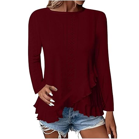 SMIDOW Long Sleeve Eyelet Tops for Women 2025 Ruffle Hem Tunic Shirts Business Casual Work Blouse Spring Fashion Clothes