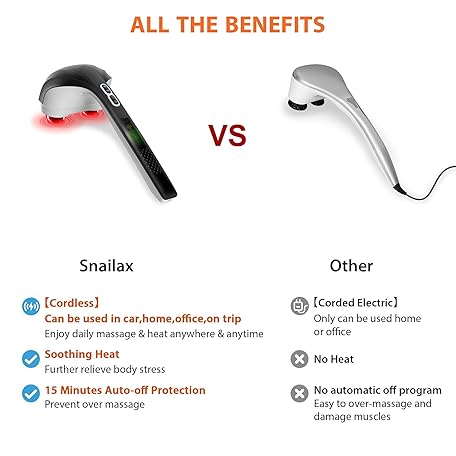 Thương hiệu Snailax là cái tên nổi tiếng được rất nhiều khách hàng trên thế giới chọn lựa. Với kiểu dáng đẹp mắt, sang trọng, sản phẩm Snailax Cordless Handheld Back Massager with Heat, Deep Tissue Percussion Massager, 3 Sets of Dual Pivoting Heads,Rechargeable Hand Held Massager for Neck,Back Shoulder,Calf,Legs là sự lựa chọn hoàn hảo nếu bạn đang tìm mua một món cho riêng mình.