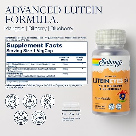 Thông tin sản phẩm SOLARAY Advanced Lutein Eyes 24 mg - Lutein and Zeaxanthin Supplements - Eye Health Support with Blueberry and Bilberry Extract - Vegan, 60-Day Guarantee, Lab Verified - 60 Servings, 60 VegCaps
