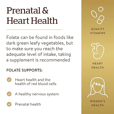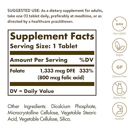 Thông tin sản phẩm Solgar Folate 1,333 MCG Dietary Folate Equivalent (800 mcg Folic Acid), 250 Tablets - Heart Health, Healthy Nervous System, Prenatal Support - Non-GMO, Vegan, Gluten Free, Dairy Free - 250 Servings
