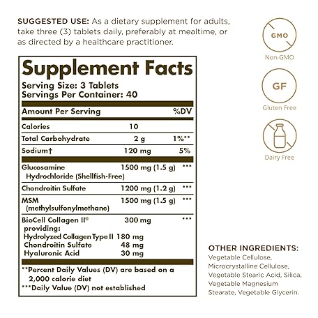 Thông tin sản phẩm Solgar Glucosamine Hyaluronic Acid Chondroitin MSM - 120 Tablets, Pack of 2 - Promotes Healthy Joints, Supports Comfortable Movement - Non-GMO, Gluten Free - 80 Total Servings