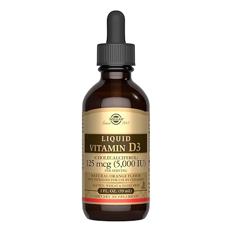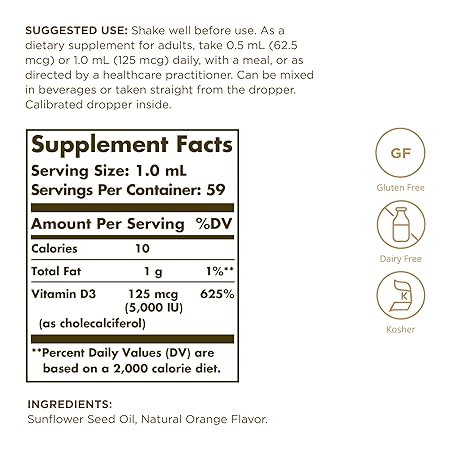 Thông tin sản phẩm Solgar Liquid Vitamin D3 125 mcg (5,000 IU) - 2 fl oz - Delicious, Natural Orange Flavor - Helps Maintain Healthy Bones & Teeth - Immune System Support - Gluten Free, Dairy Free, Kosher - 59 Servings
