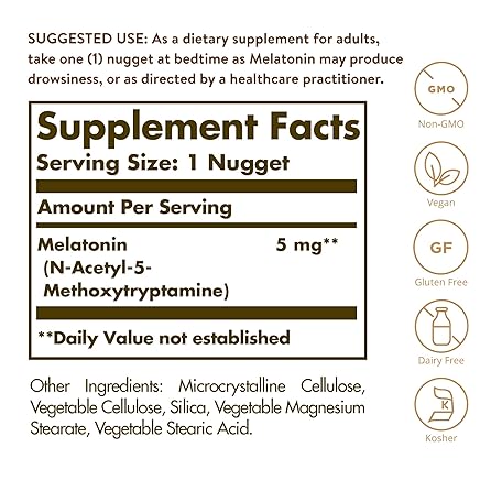 Thông tin sản phẩm Solgar Melatonin 5 mg, 120 Nuggets - Helps Promote Relaxation & Rest - Clinically Studied Melatonin - Vegan, Gluten Free, Dairy Free, Kosher - 120 Servings