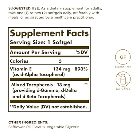 Thông tin sản phẩm Solgar Vitamin E 200 IU - 100 Softgels - Natural Antioxidant, Immune System Support - Gluten Free, Dairy Free - 100 Servings