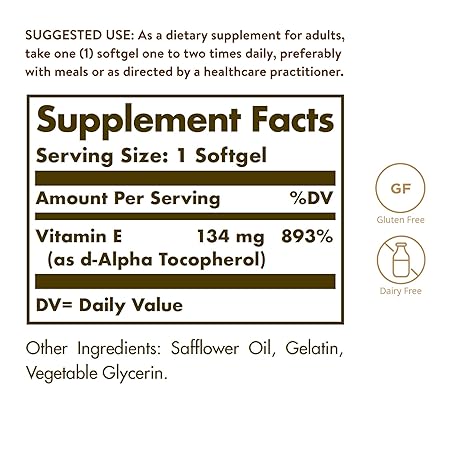 Thông tin sản phẩm Solgar Vitamin E 200 IU Alpha, 100 Softgels - Antioxidant, Healthy Aging, Healthy Skin, Immune System Support - Natural Source Vitamin E - Gluten Free, Dairy Free - 100 Servings