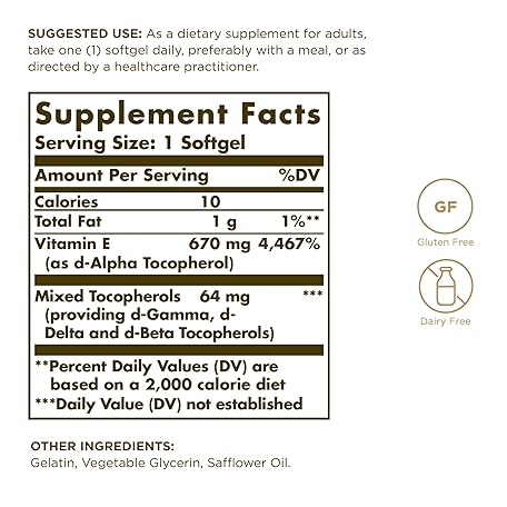 Thông tin sản phẩm Solgar Vitamin E 670 mg (1000 IU) - 100 Softgels, Pack of 2 - Naturally Sourced - Gluten Free, Dairy Free - 200 Total Servings