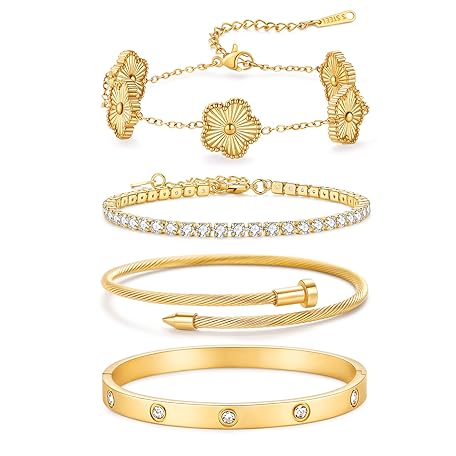 Solistra 18K Gold Plated Bangle Bracelets for Women Stackable Nail Tennis Clover Love Bracelets Non Tarnish Gold Jewelry Set