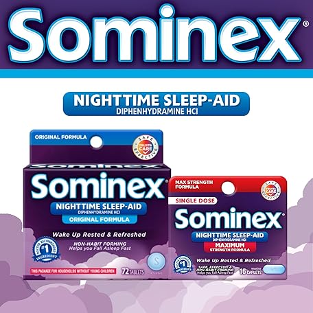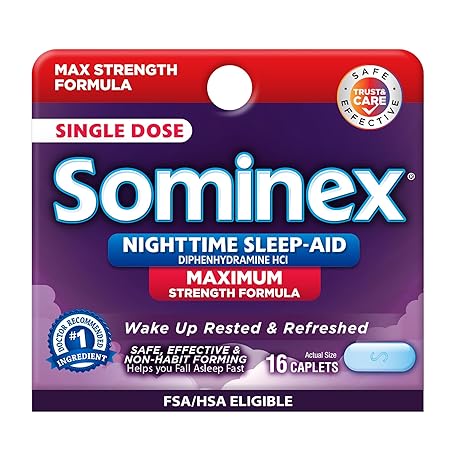 Thông tin sản phẩm Sominex Nighttime Sleep-Aid Tablets, Maximum Strength Formula, Single Dose, Assorted, 16 Count