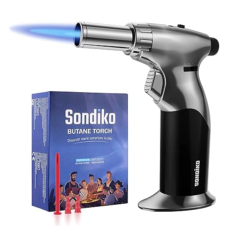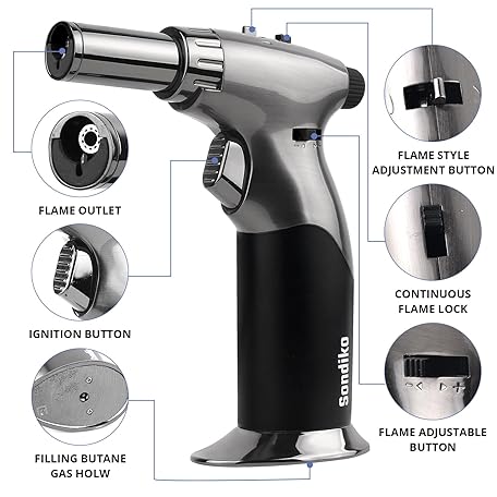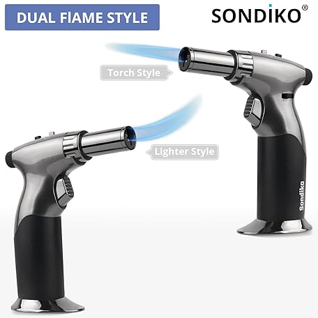 Thông tin sản phẩm Sondiko DUAL Style Flame Butane Torch Lighter, Adjustable Flame Size Butane Lighter, Refillable Blow Torch with Continuous Flame Lock for Creme Brulee, Cooking(Butane Gas Is Not Included)