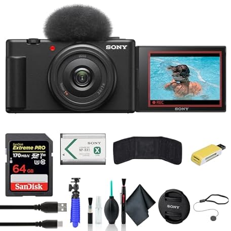 Thông tin sản phẩm Sony ZV-1F Vlogging Camera (Black) 20.1 MP 1” Sensor | Ultra-Wide 20mm Lens |4K Video | Compact Creator Kit with Case, 64GB Card, Card Reader, Flex Tripod, Memory Card Wallet, Cap Keeper, Cleaning Kit