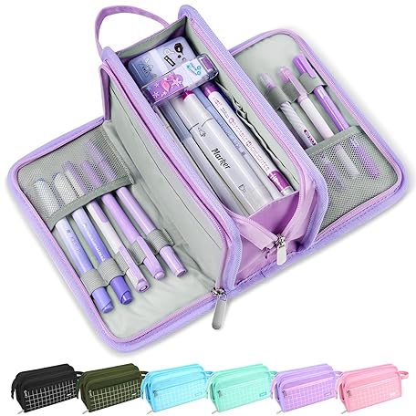 Thông tin sản phẩm Sooez Large Pencil Case, Big Capacity Pencil Pouch Pen Bag with 3 Compartment, Portable Canvas Stationery Organizer with Zipper, Cute Aesthetic School Supplies for Teen Girls, Purple with Plaid