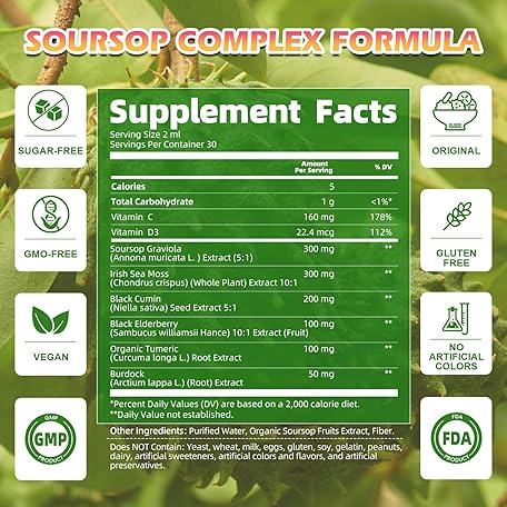 Thông tin sản phẩm Soursop Bitters Liquid Drops with Irish Sea Moss, Black Seed Oil, Soursop Graviola Leaves Extract - Multivitamin Complex Supports Antioxidant, Slowing Cell-Aging, Gut Cleanse, Detox & Immunity Health