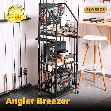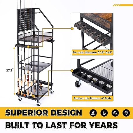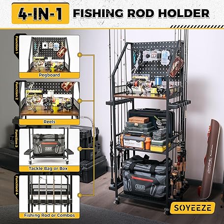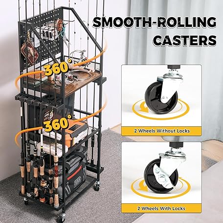 SOYEEZE Fishing Rod Holders for Garage, Fishing Pole Holders Up to 12 Rods with Pegboard and Hooks,Rolling Fishing Cart with Wheels, Fishing Gear Storage For Tackle Box & Reel Organization