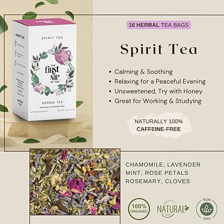 Thông tin sản phẩm Spirit Tea, Herbal Tea Bags, Chamomile, Lavender, Rose, Cloves, Caffeine-Free, Calming Stress Relief & Health Support Evening Tea - 16 Cups | The Spice Hut, First Sip Of Tea