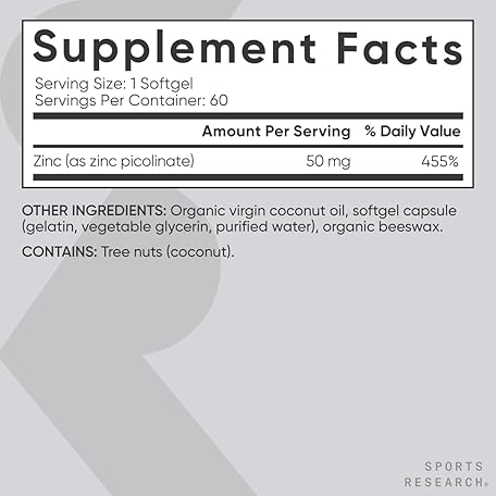 Thông tin sản phẩm Sports Research Zinc Picolinate 50mg with Organic Coconut Oil | Highly Absorbable Zinc Supplement for Healthy Immune Function - Non-GMO Verified, Gluten & Soy Free (60 Liquid Softgels)